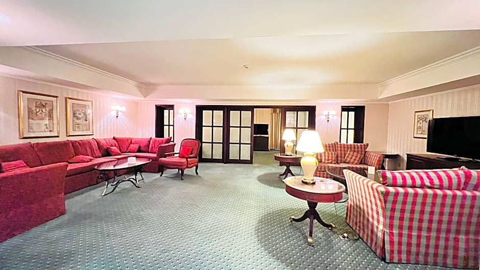 This room has a mini-bar and a seating area with a TV. It also has a marble bathroom.
