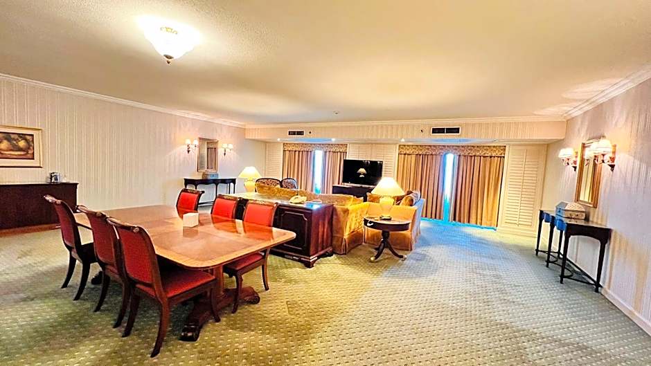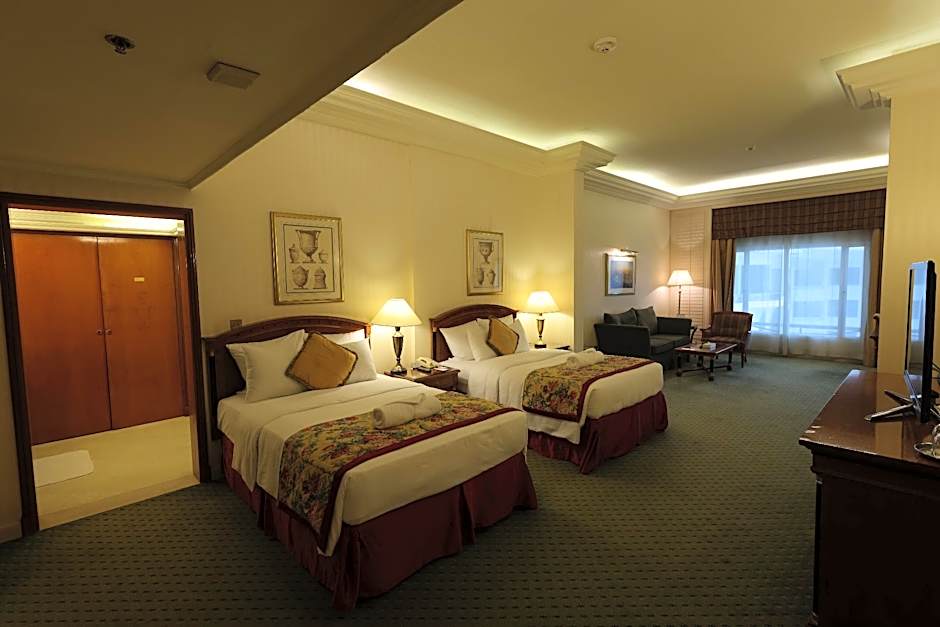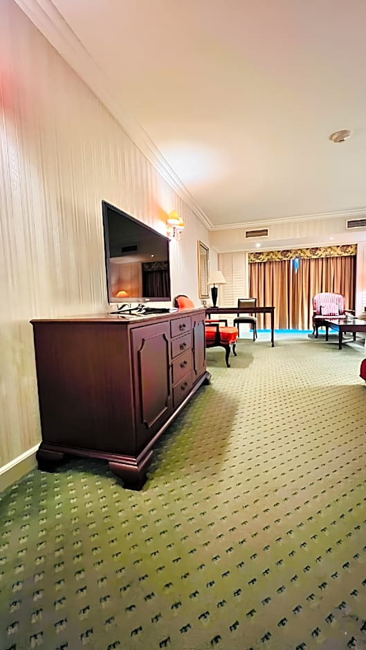 This room has a mini-bar and a seating area with a TV. It also has a marble bathroom.